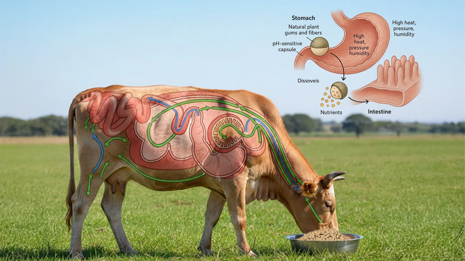 We blend natural plant gums and fibers as encapsulants that lock in over 95% of your nutrients—even under high heat, pressure, and humidity. Thanks to their pH‑sensitive design, they stay intact in the rumen conditions and then dissolve in the acidic and alkaline conditions, releasing the right nutrients exactly where animals need them.